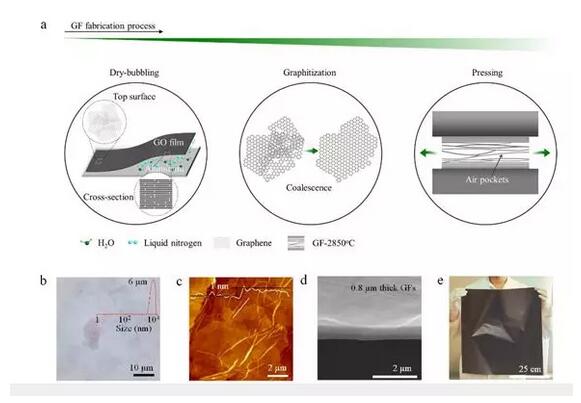 圖1. 石墨烯薄膜制造工藝. a)干法鼓泡分離薄膜,石墨化及壓延工藝示意圖. b) 高速剪切混合發(fā)制備平均直徑為6微米的氧化石墨烯光學顯微鏡照片. c) 小于1 納米厚的氧化石墨烯原子力顯微鏡照片. d) 0,8微米的石墨烯薄膜掃描顯微鏡照片. e) 柔性大面積石墨烯薄膜光學顯微鏡照片。