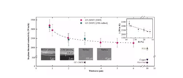 圖2. 28500C,13000C處理的石墨烯薄膜, 商用碳化石墨薄膜橫向熱導率,銅,鋁熱導率的比較。測試方法:真空焦耳自加熱及熱橋發(fā)。圖中照片展示了28500C處理及壓延過的石墨烯薄膜的截面及表面。圖中插圖展示石墨烯薄膜橫向熱導率與無序疊加排列的石墨烯的相對體積含量之間的關系。