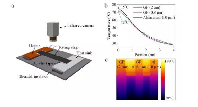 圖3. 石墨烯新型散熱片的展示。a)熱測試平臺. b)0,8微米, 2微米厚28500C熱處理過石墨烯薄膜與10 微米鋁膜的溫度分布比較. c)紅外照片。