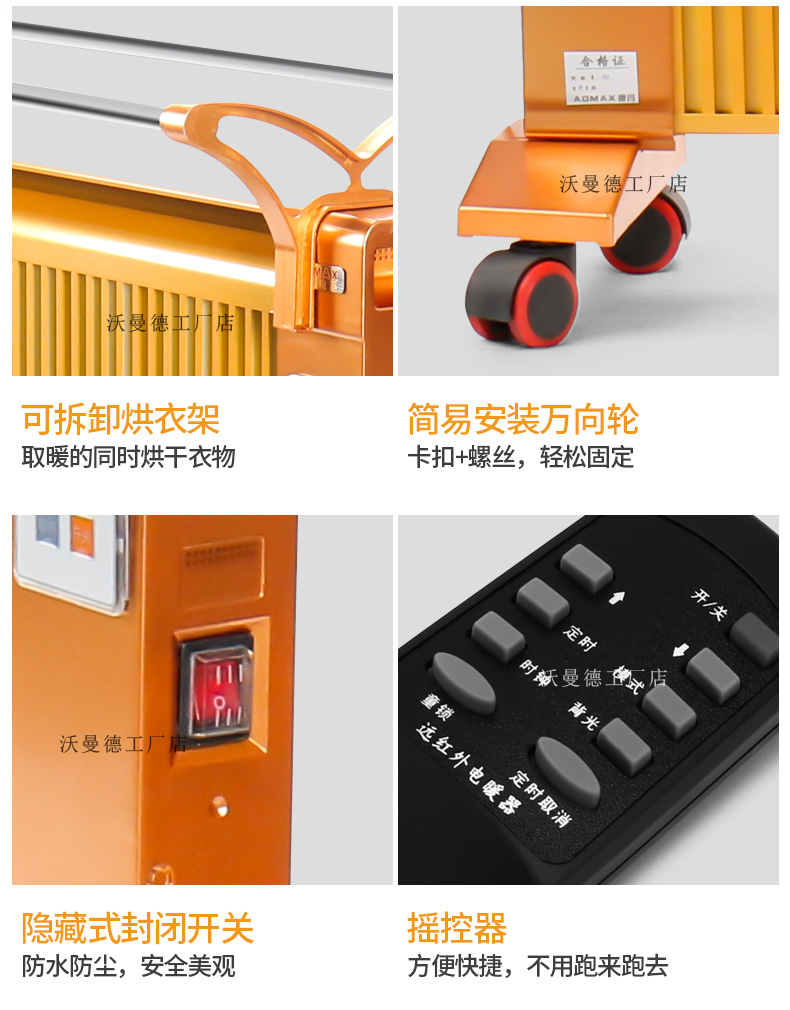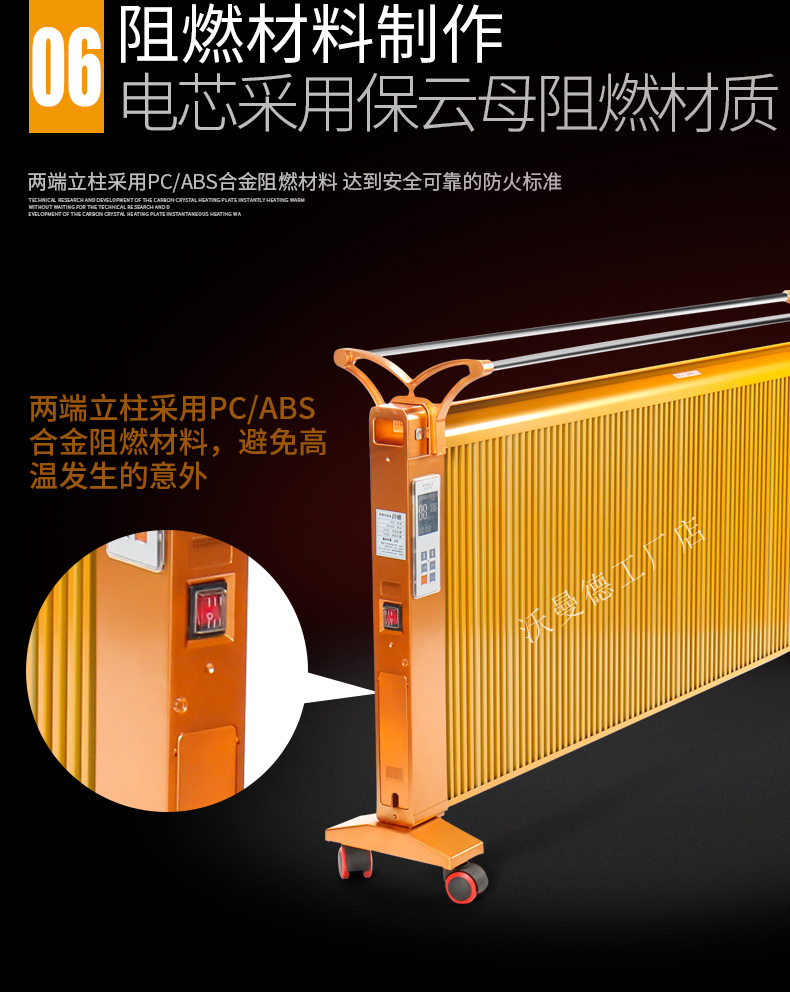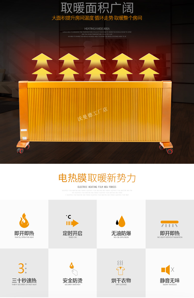 碳晶原子以“布朗運(yùn)動(dòng)”原理為基礎(chǔ)通過遠(yuǎn)紅外制熱,熱轉(zhuǎn)換率可達(dá)99.8%。,全面散熱,比普通的電暖器熱量提高1倍,帶萬向輪底座,膨脹螺絲,壁掛,移動(dòng),方便好用,讓室內(nèi)不在干燥。